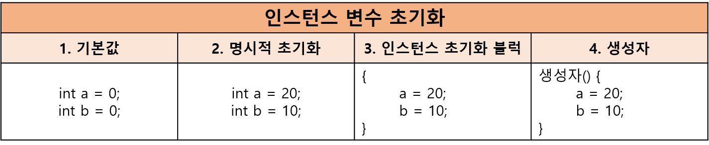 그리고 클래스 변수 초기화에서는 없었던 생성자에 의한 초기화가 추가되었다.
